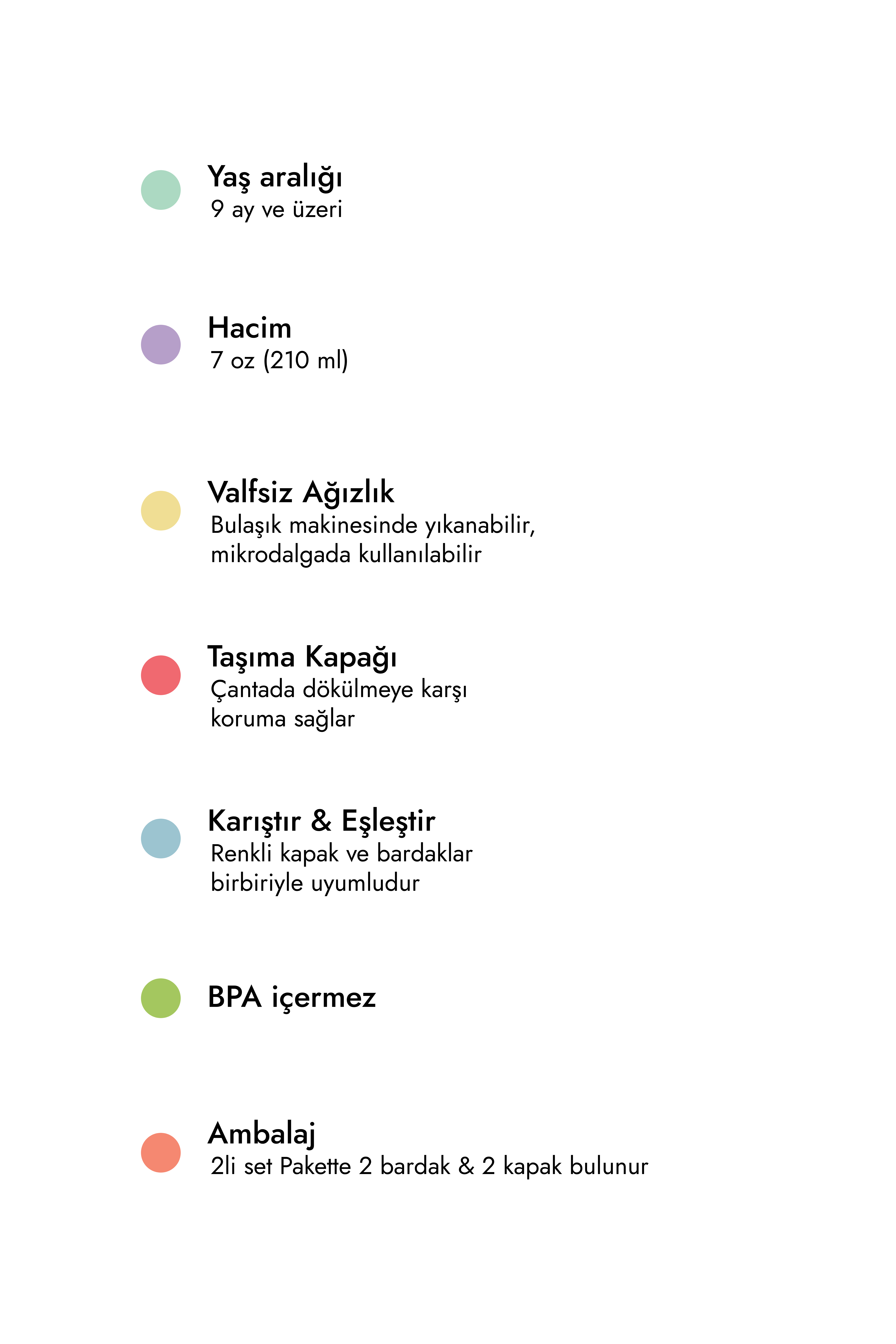 Canlı renkleri çocukların ilgisini çekerken, karıştır & eşleştir özelliği sayesinde farklı kapak ve bardaklar birbiriyle uyumlu şekilde kullanılabilir.
